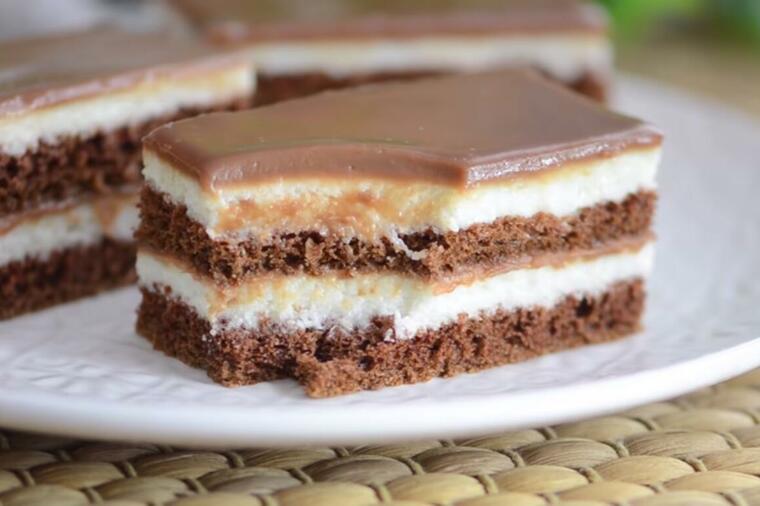 Состојки за кората: 6 белки, 6 жолчки, 6 лажици шеќер, 6 лажици брашно, 1 прашок за пециво, 4 лажици какао во прав, 6 лажици топла вода.