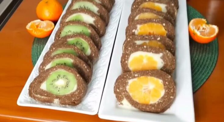 Смесата од еден сад превртете ја на хартија за печење во правоаголник со сукало, доколку треба малку да ги исечете страните, за да има правилна форма. Нанесете половина од пудингот, израмнете и ставете 8 мандарини една до друга по целата должина. Завиткајте во ролни со хартија. Истото повторете го и со киви ролатот.