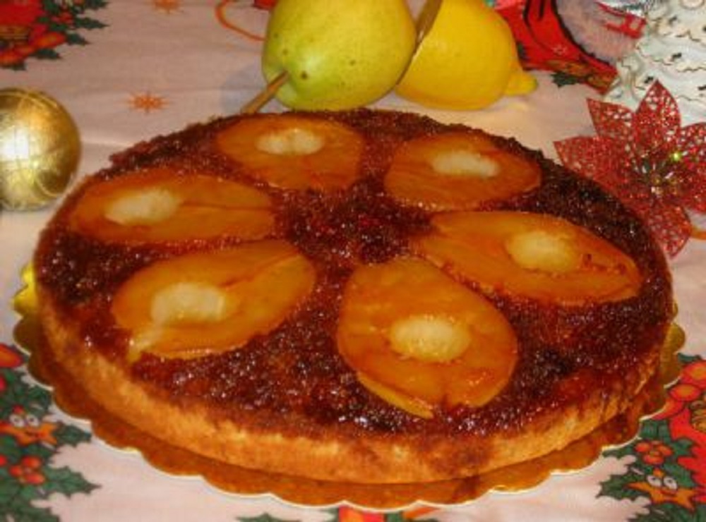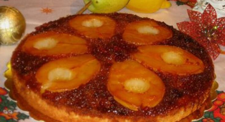 Сервирајте го превртениот колач со круша, попрскана со шеќер во прав.