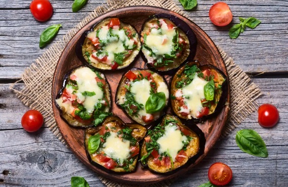 На секој круг модар патлиџан ставете парче домат, посипете сирење или пармезан и посипете со малку магдонос или босилек.
